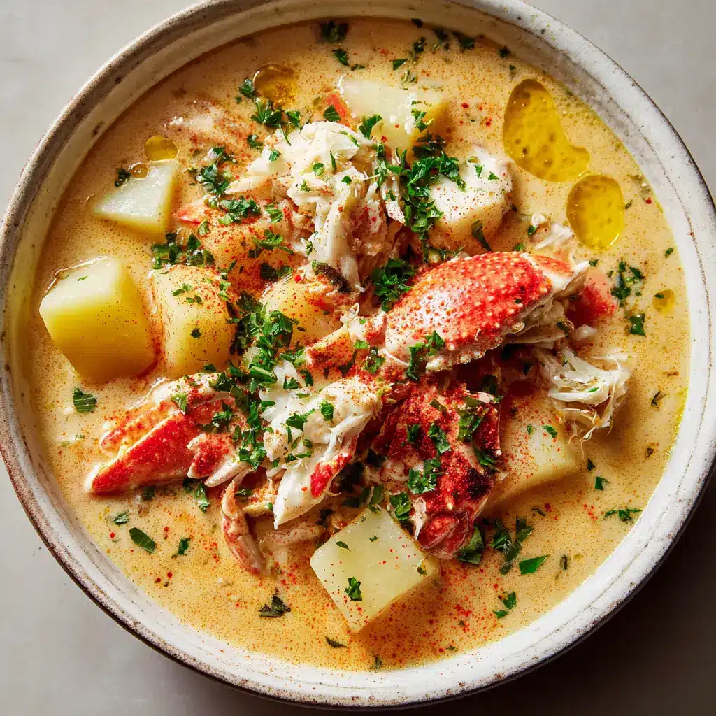 Ladle the thick stew into rustic white ceramic bowls, ensuring each portion receives tender potatoes, lump crab, and a dramatic snow crab leg cluster partially submerged. Drizzle the surface with small floating pools of melted yellow butter. Generously garnish the bowl with a vibrant dusting of reddish-orange paprika and finely chopped fresh green parsley flakes.