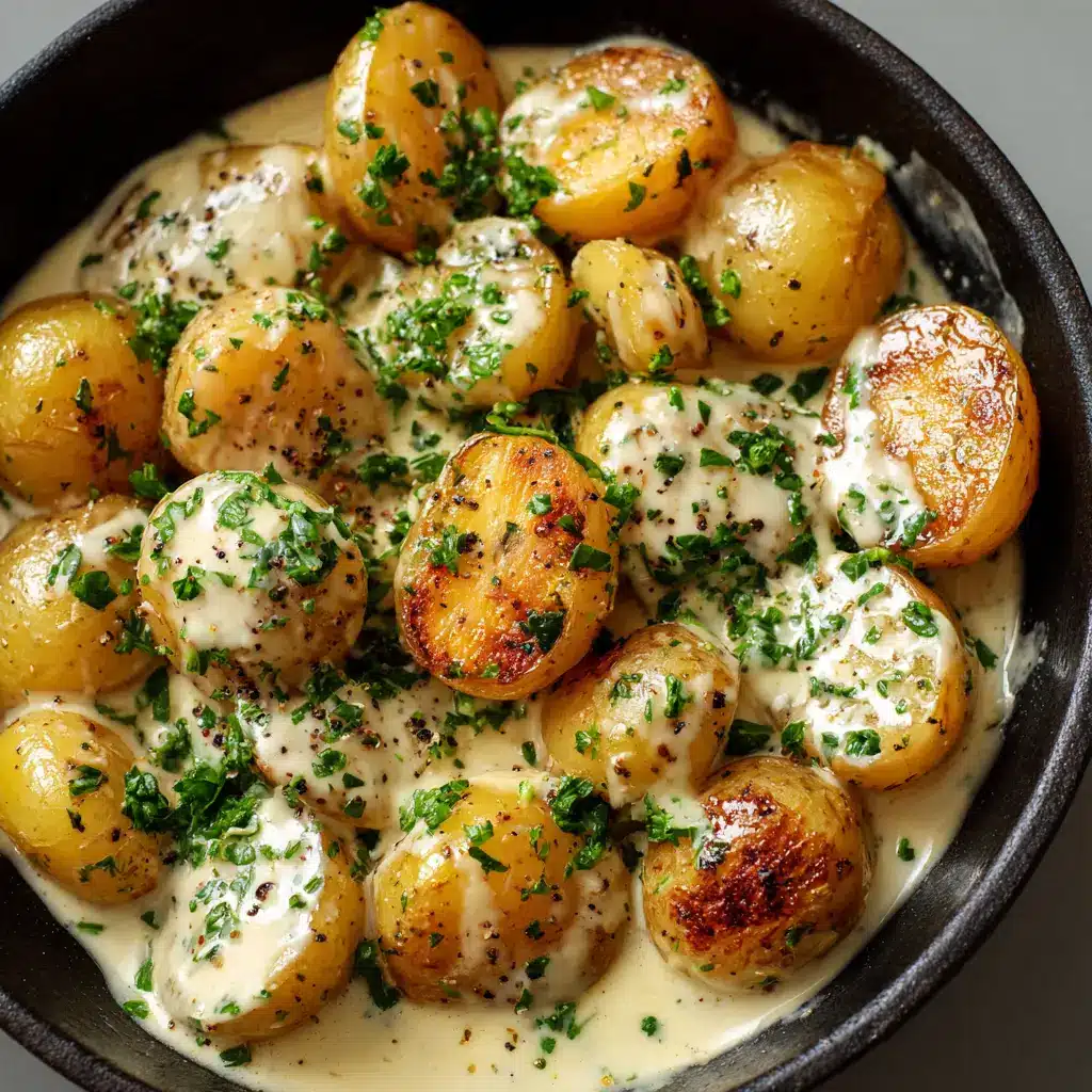 Tender, boiled baby potatoes are pan-seared to golden perfection and smothered in a thick, glossy, off-white garlic butter cream sauce. The ultimate comfort side dish garnished with fresh parsley and black pepper.