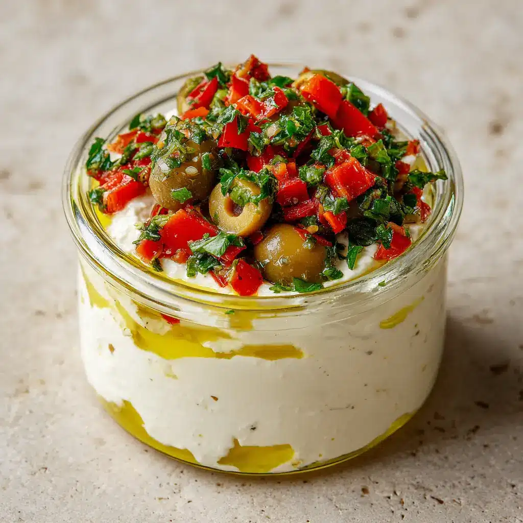 Spoon the whipped feta and cream cheese base into your serving jar or bowl, using the back of a spoon to create a nice swirl or well on top. This will help hold the toppings. Generously pile the chopped olives and diced red peppers over the center of the dip. Sprinkle the fresh parsley over everything.