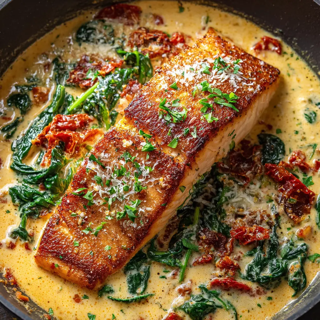 Return the seared salmon fillets to the skillet, nestling them into the creamy sauce. Spoon some of the sauce over the top of the salmon. Let it all simmer together for one final minute to allow the flavors to meld. Garnish generously with finely chopped fresh parsley and an extra dusting of Parmesan before serving.