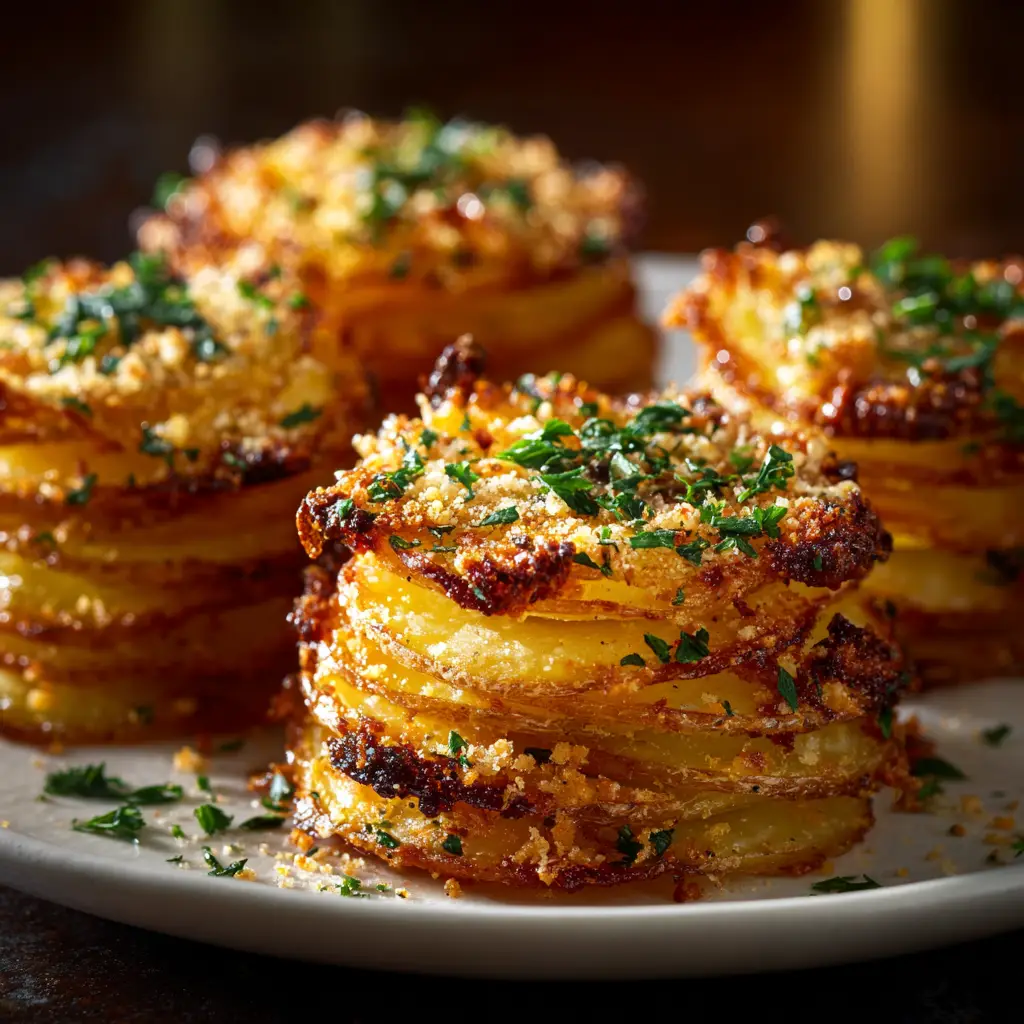 A detailed shot of cheesy potato stacks fresh from the oven, with golden, crispy edges and garnished with fresh herbs.