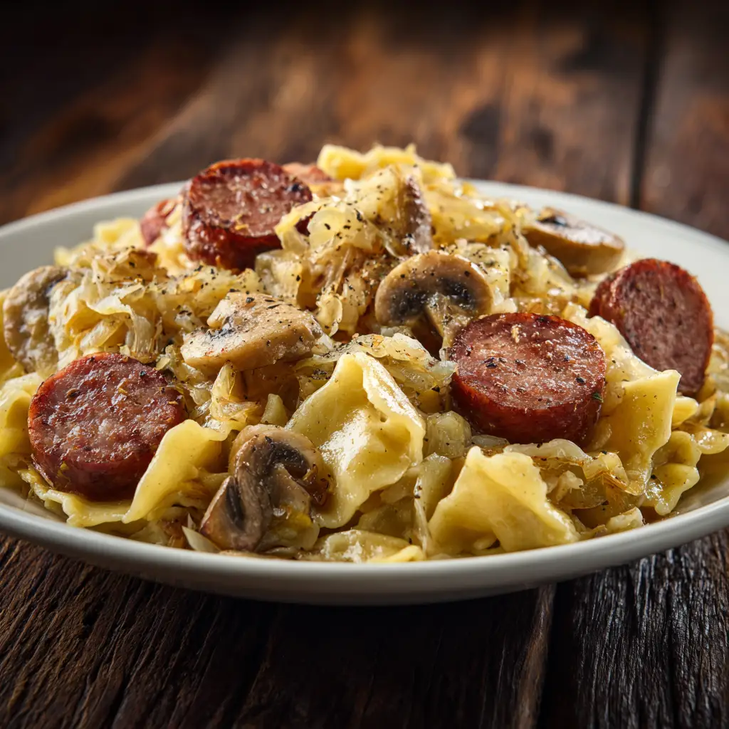 - Return the cooked bacon and kielbasa to the skillet. Add the cooked and drained pasta. Stir everything together gently until well combined and heated through. Taste and adjust seasoning with more salt and pepper if needed. Serve hot, garnished with fresh dill or parsley if desired.