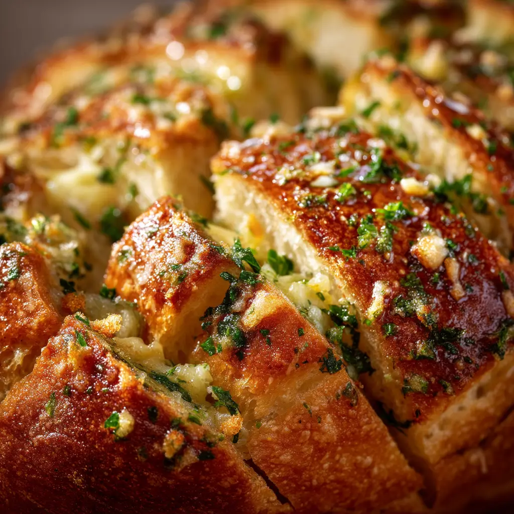 A detailed view of the flaky, herb-flecked layers of the garlic butter bread before serving.